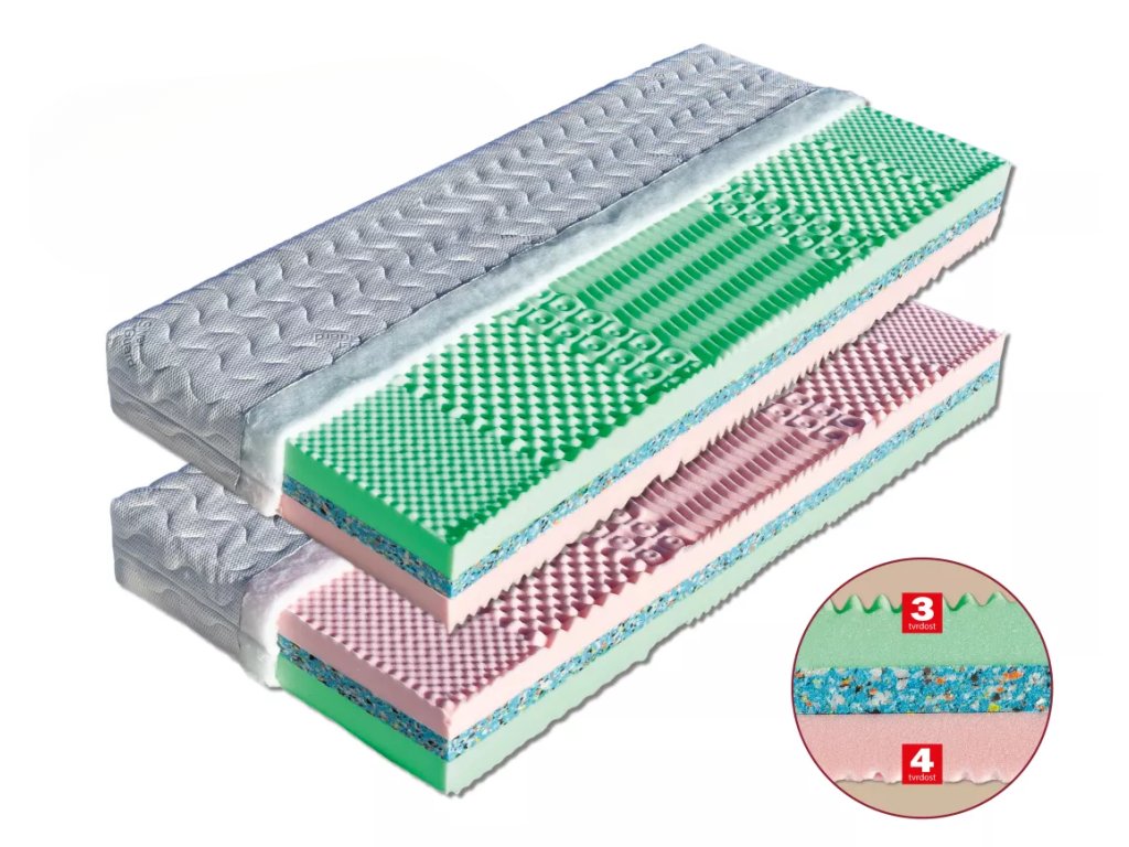 Srdcem matrace je zpevněné jádro z pojeného polyuretanu (PUR RE 80). Tento materiál je známý svou vysokou hustotou a odolností, což matraci dodává vynikající stabilitu a výrazně prodlužuje její životnost. Můžete se spolehnout, že si matrace udrží své vlastnosti po mnoho let intenzivního používání.