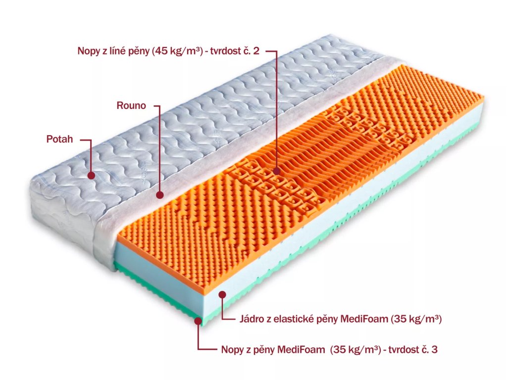 Matrace Malaga je navržena jako sedmizónová, což znamená, že je anatomicky rozdělena do oblastí, které poskytují optimální podporu každé části vašeho těla. Díky tomuto rozdělení se matrace dokonale přizpůsobuje tvaru páteře a kloubů, čímž zajišťuje správné ortopedické vlastnosti a maximální komfort po celou noc.