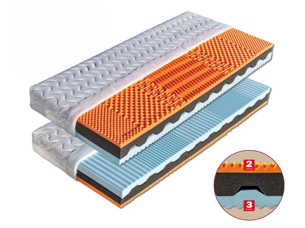 Jedinečnou vlastností této matrace je její oranžová nosná vrstva, která je tvořena luxusní paměťovou pěnou (45 kg/m³). Tato pěna se pod vlivem tělesné teploty a tlaku dokonale přizpůsobí konturám vašeho těla, čímž minimalizuje tlakové body a zajišťuje maximální komfort. Navíc je tato vrstva tvarována do masážních nopů, které během spánku jemně stimulují pokožku a podporují prokrvení, což přispívá k hlubší relaxaci a regeneraci.